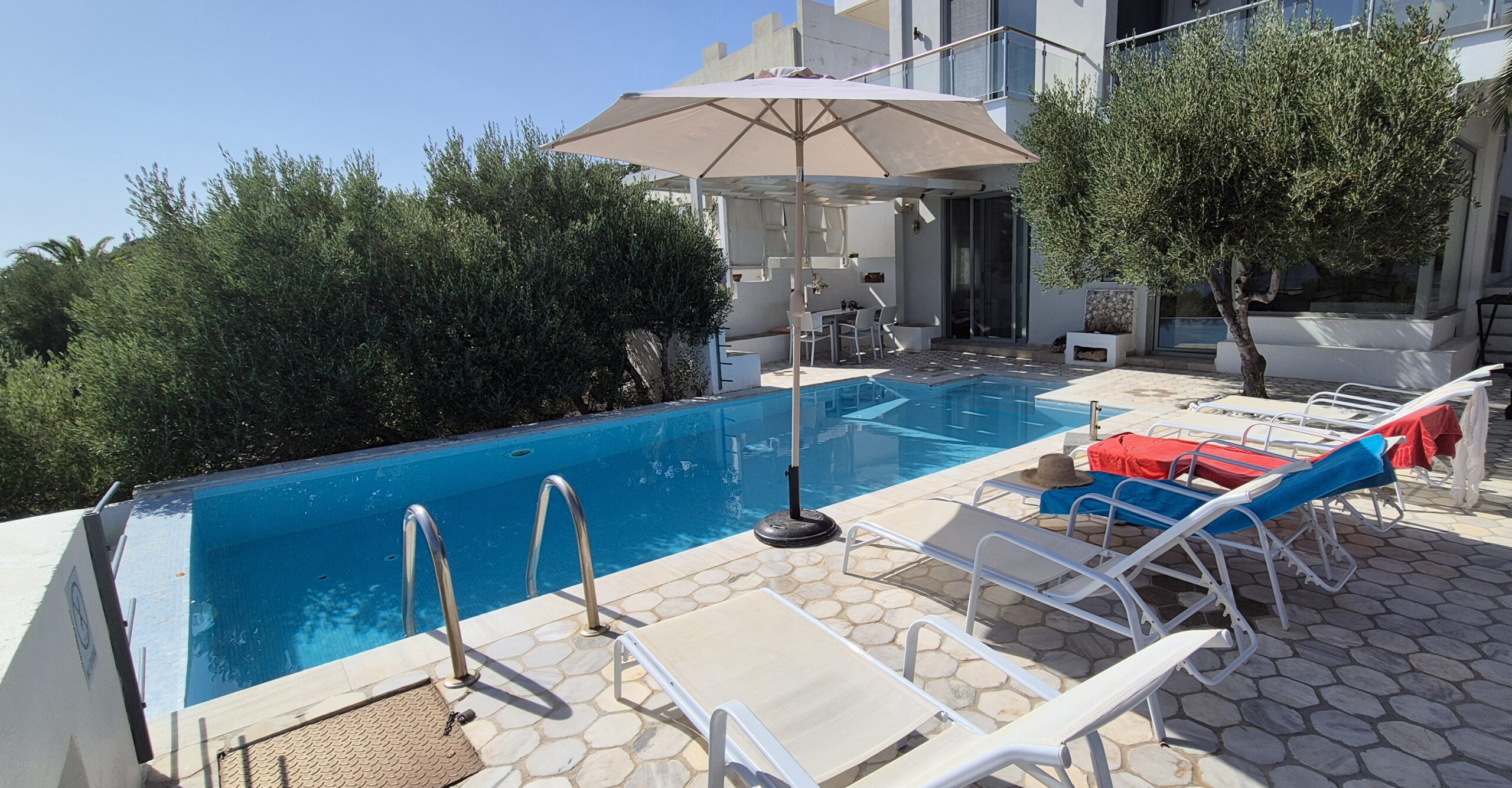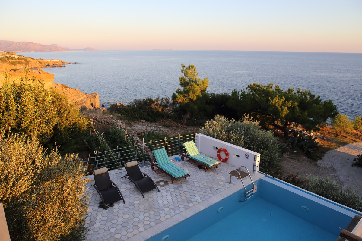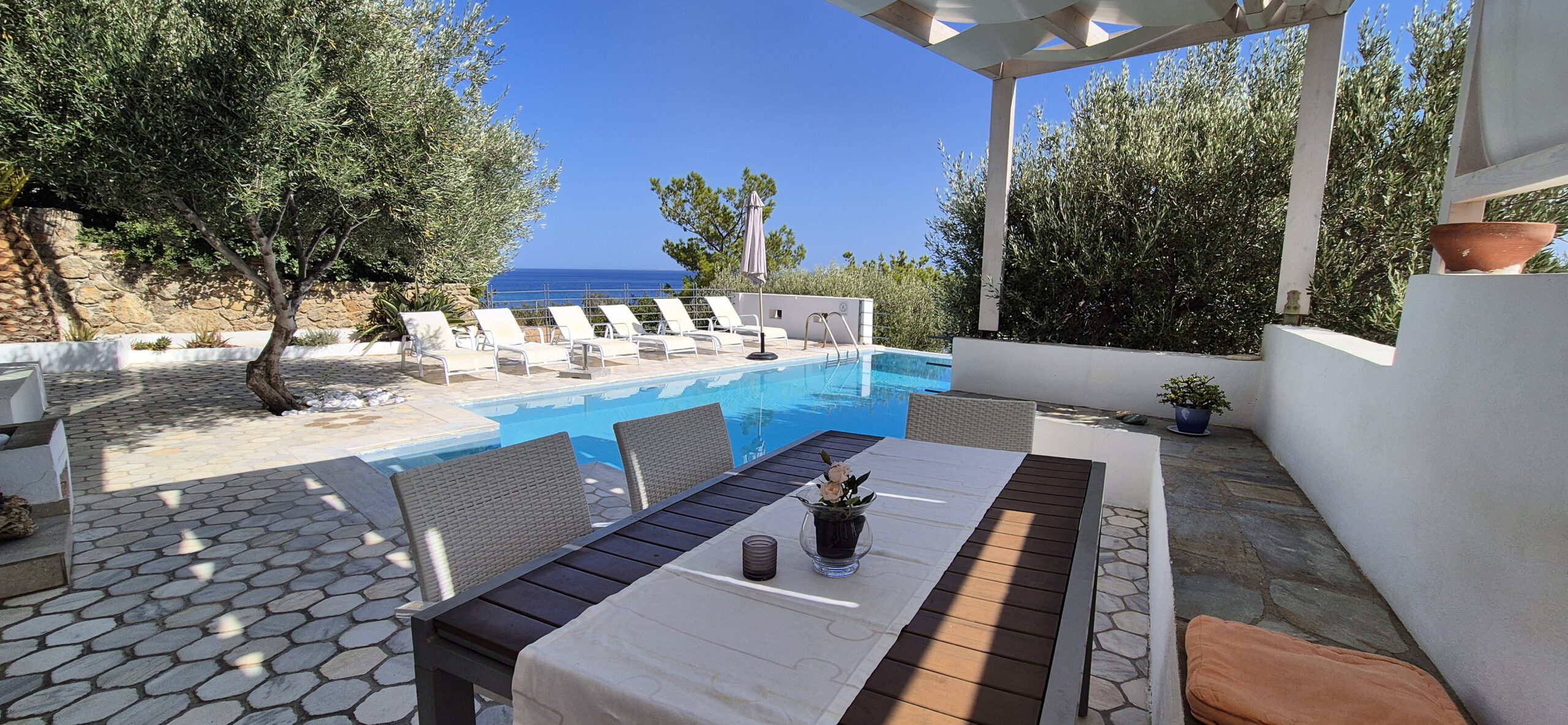 Ein privater Pool und ein traumhafter Meerblick sorgen für echtes Urlaubsgefühl. Vom Grundstück aus führt ein direkter Zugang zum Meer – einfach die Stufen hinunter und schon erreicht man das Wasser. Eine malerische Badebucht mit Strandtaverne ist zudem in nur fünf Gehminuten erreichbar und lädt zu entspannten Stunden am Meer ein.